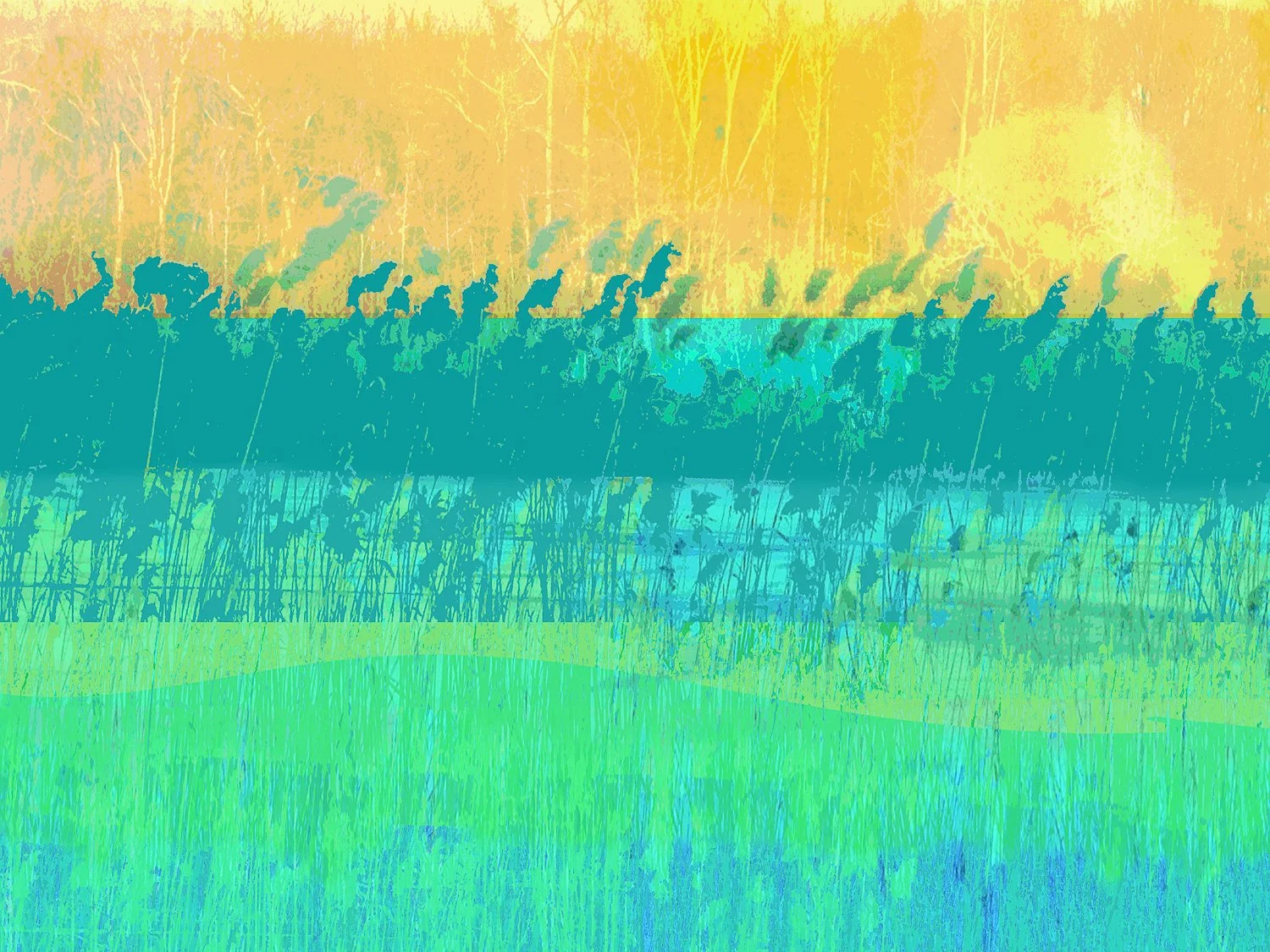 Sprawling vibrant vista depicting a green rippling and reflective lake, panorama of deep blue and teal reeds on the horizon, with a beautiful pale chartreuse sky.