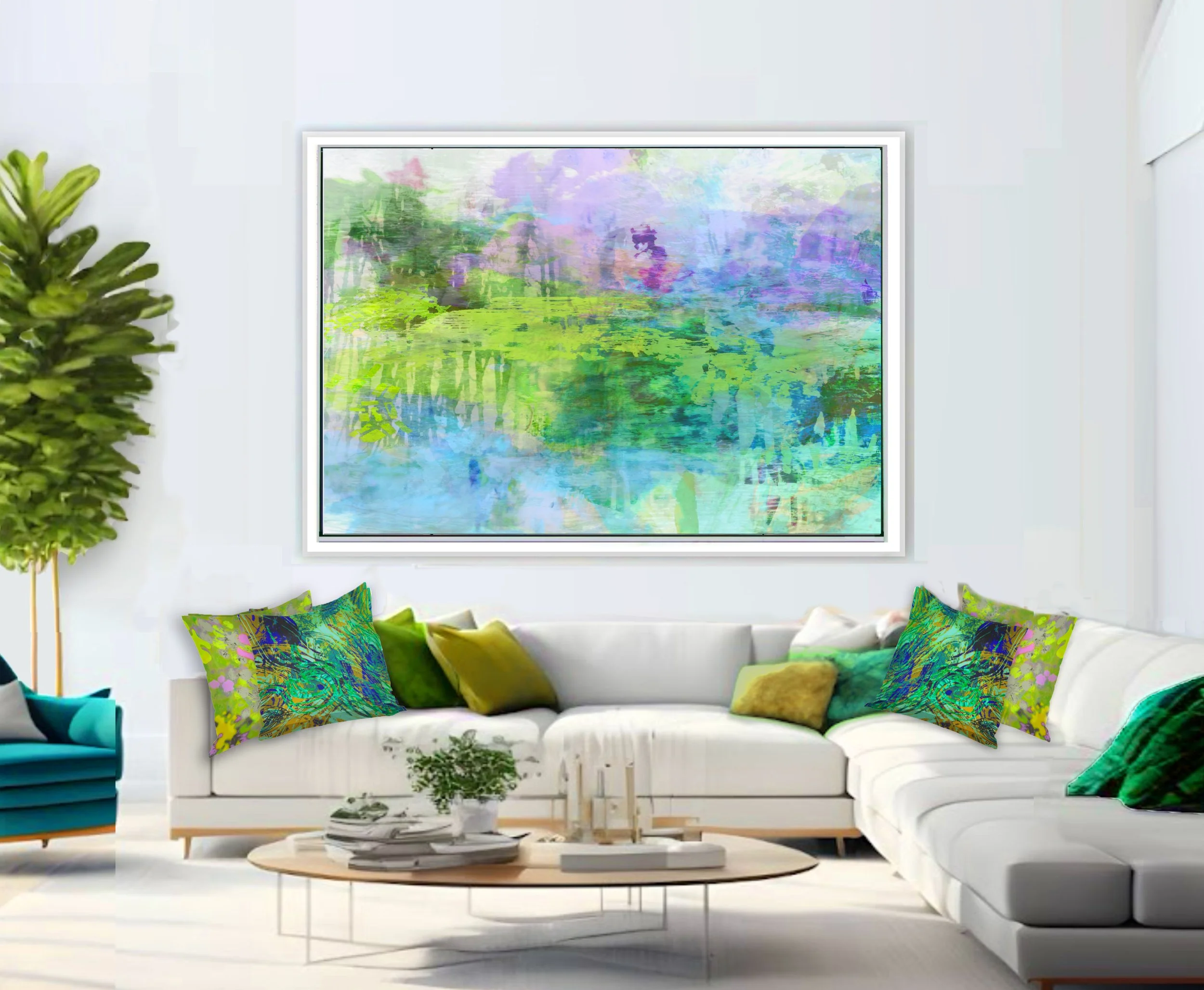 SRA Limited Edition print depicting a contemporary and abstract landscape with monotype marks reflected in ripples of water. Cool hues of blues, turquoise and purples. A tranquil and calming image.