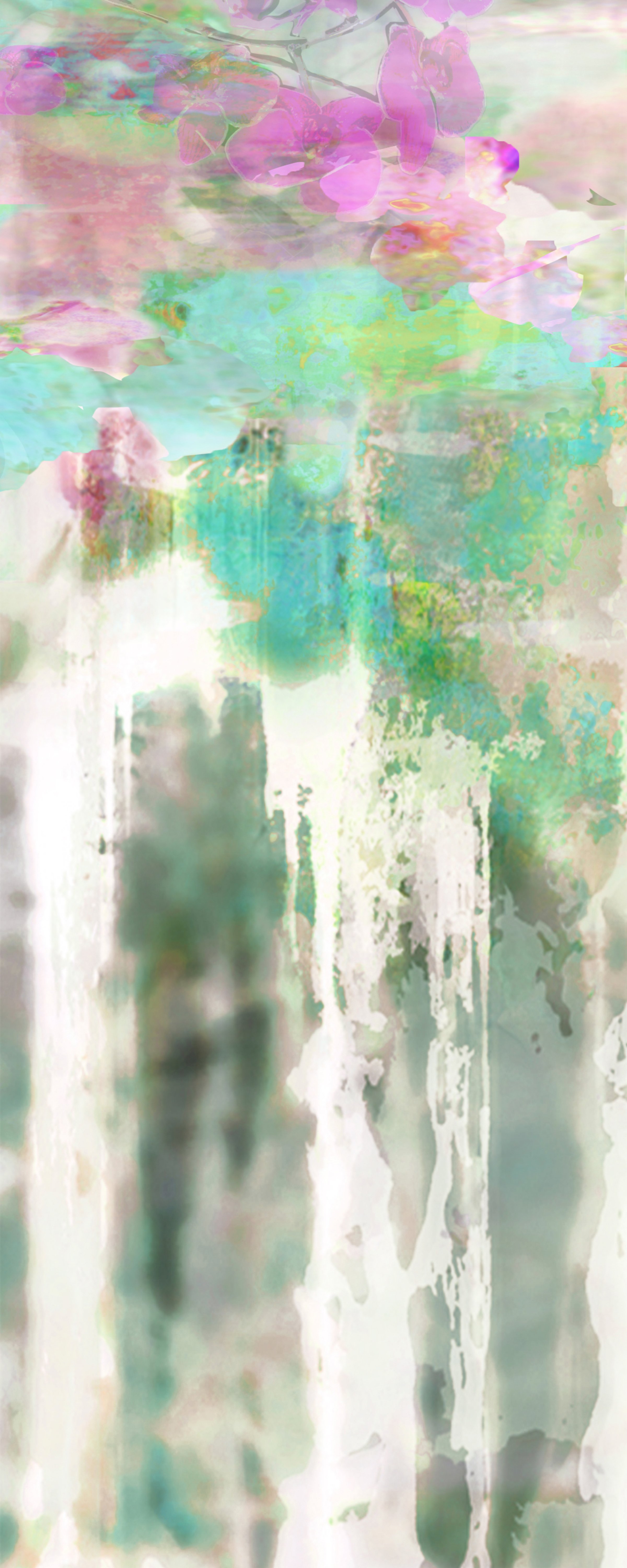 SRA abstract and contemporary print of cascading waterfalls with a profusion of cherry blossoms and orchids in pink, teal, muted green gray, and white. The work incorporates monotype marks, and is light and airy.